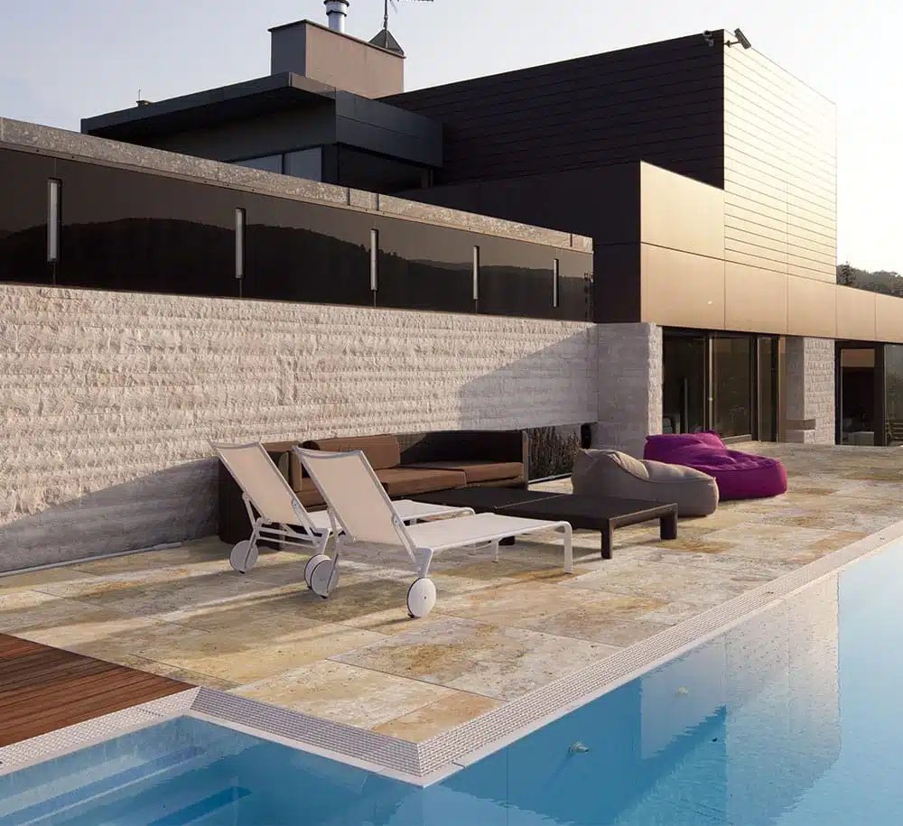 - Les extérieurs : terrasses, patios, bords de piscine… la pierre relie dedans et dehors avec élégance
