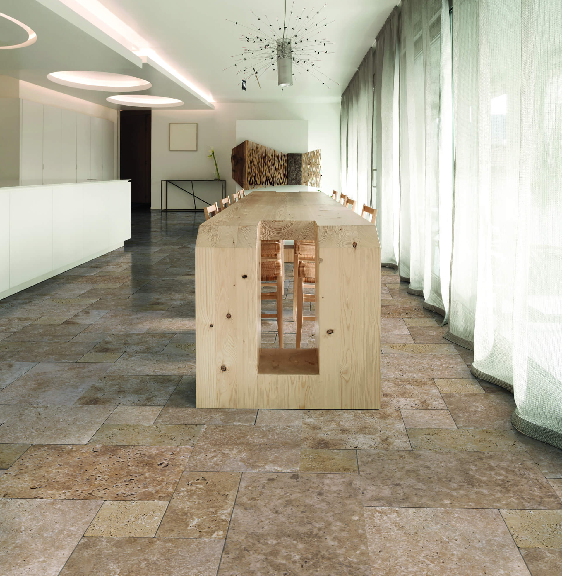 • Salon: Un sol en travertin caramel crée un cadre chaleureux et naturel, idéal pour la détente.
